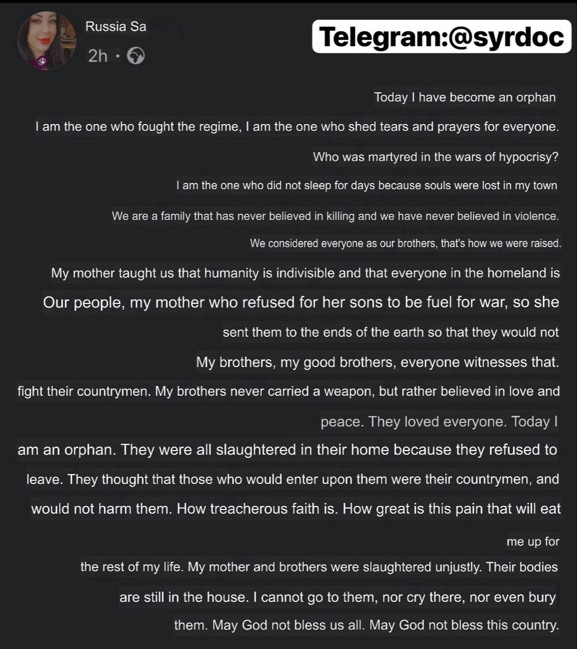 Syrian activist Rasha, known for her work with the Syrian Center for Justice and Accountability, mourns the loss of her mother and siblings, who were killed by HTS militants during today’s raid on #Baniyas—a tragedy that speaks volumes about the brutality unleashed.