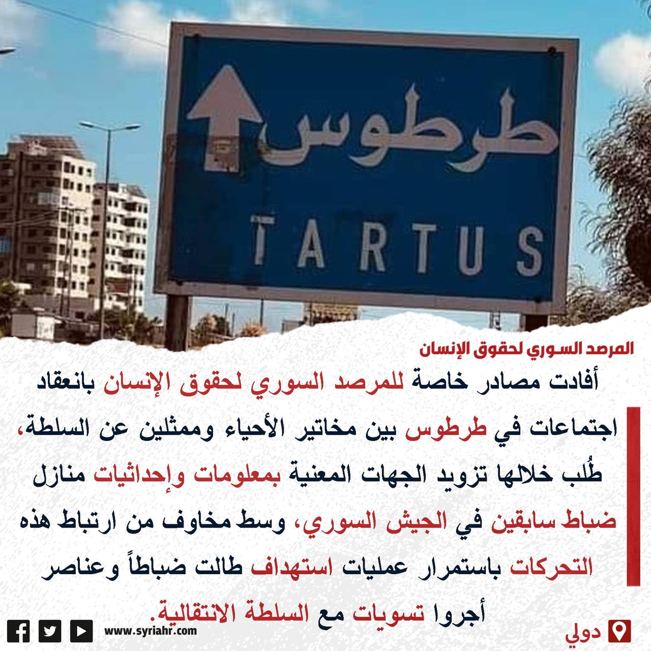 المرصد السوري لحقوق الإنسان يحذر من اجتماع بين مخاتير الأحياء وممثلين عن سلطة الإرهاب في طرطوس، للحصول على معلومات عن منازل ضباط سابقين ، ومخاوف من أن جمع المعلومات بغية استهدافهم.