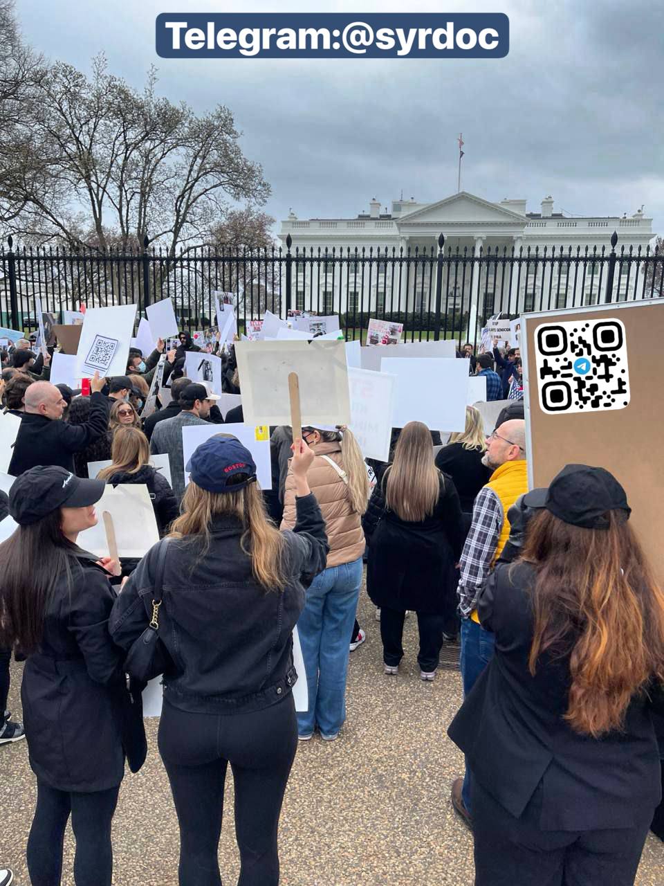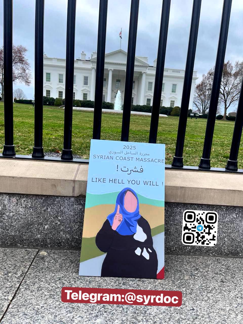نظم نشطاء سوريون وقفة أمام البيت الأبيض، حاملين صور الضحايا ولافتات تطالب بوقف القتل الممنهج في الساحل السوري. وتم تضمين QR code للقناة، كرسالة مبطنة من المشاركين: “الإعلام، مهما كتم الحقيقة، سنجد ألف طريقة لإيصالها."