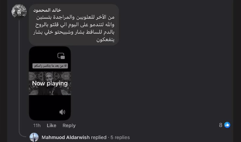 تقوم أكبر صفحة على الفيسبوك مخصصة للقرية، والتي تحمل اسم “تسنين” ويبلغ عدد متابعيها حوالي ثلاثين ألف متابع، بالتحريض بشكل يومي على قتل وتهجير جيرانهم من العلويين، كما تنتشر تعليقات من أهالي القرية تشجع على هذه الأفعال (تم إرفاق عدة صور لهذه التعليقات). يُذكر أن معظم أهالي القرية من العلويين قد هجروها نتيجة تكرار حالات القتل والخطف واقتحام المنازل والسرقة والضرب والإهانة.
