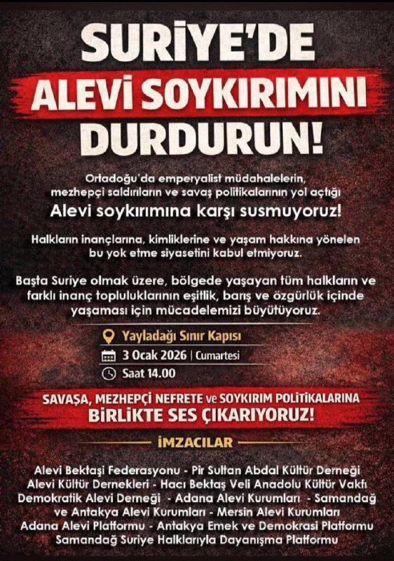 “من أجل العلويين، من أجل الدروز، من أجل الأكراد، من أجل الأرمن، من أجل المسيحيين، من أجل جميع المضطهدين! لن نصمت أمام سياسات الإبادة! نلتقي عند المعبر الحدودي يوم السبت 3 يناير 2026 الساعة الثانية بعد الظهر!”