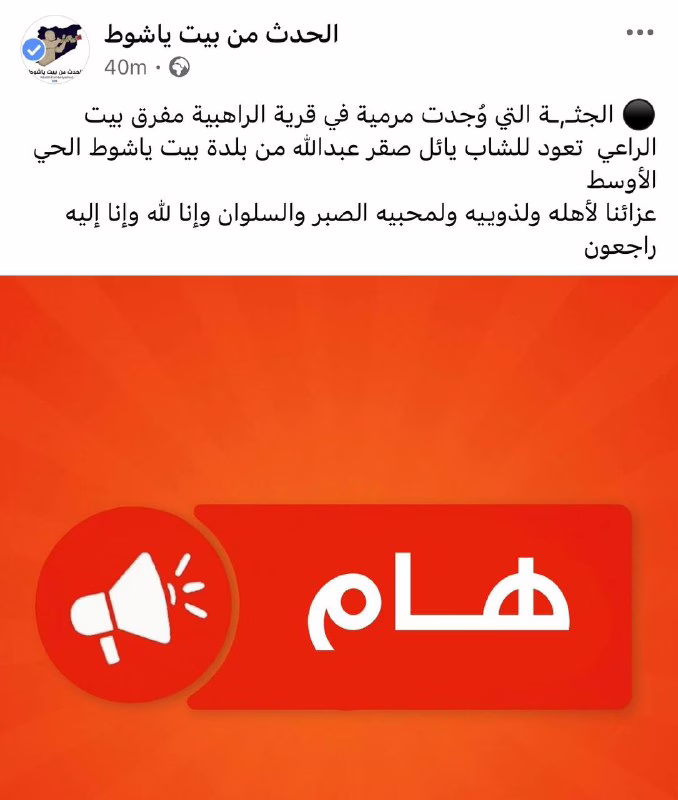 ريف جبلة: الجثة التي تم العثور عليها مرمية في قرية الراهبية عند مفرق بيت الراعي تعود للشاب يائل صقر عبدالله (عزيز)