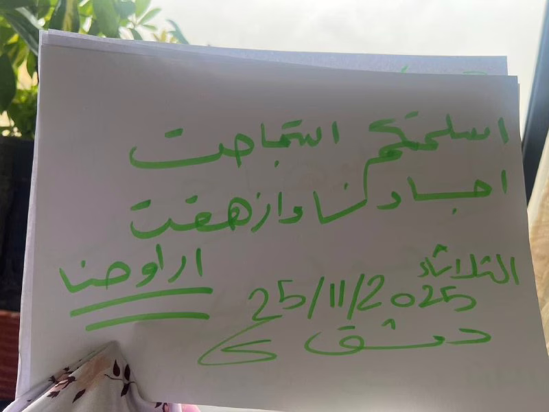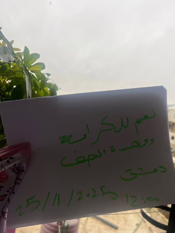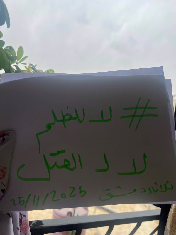 مواطنو دمشق يخوضون اعتصامات إلكترونية رفضاً للقتل والطائفيةThe Alawitesنوفمبر 25, 2025Crime صور من دمشق لمواطنين يشاركون باعتصامات الكترونية تعبيراً عن آرائهم ورفضهم للقتل والطائفية View Source شارك مشاركة على Facebook مشاركة على X (Twitter) مشاركة على Pinterest مشاركة على LinkedIn مشاركة على Reddit مشاركة على Telegram مشاركة على WhatsApp مشاركة على Threads The Alawites المقالات: 3663 الCrime السابقة علويو طرطوس يحتجون على استهداف أبناء طائفتهم الCrime التالية جنرال فيلم الديكتاتور يظهر في واقع سوريا مقالات مشابهة تحديد موقع مجزرة المختارية في ريف اللاذقيةسبتمبر 19, 2025 اختفاء شاب علوي في الشيخ بدر بريف طرطوسنوفمبر 3, 2025 مليشيات الأمن العام تختطف أباً وابنه علويين في ريف حماةديسمبر 15, 2025 الأكثر مشاهدة عصابات الجولاني الإرهابية تغتال شابا مسيحيا في محردة بحثا عن ذهبعصابات الجولاني الإرهابية تختطف طبيبا علويا في حمصمعلمو اللاذقية وطرطوس يعتصمون ضد فصل عصابات الجولاني الإرهابية لهم على أساس طائفي