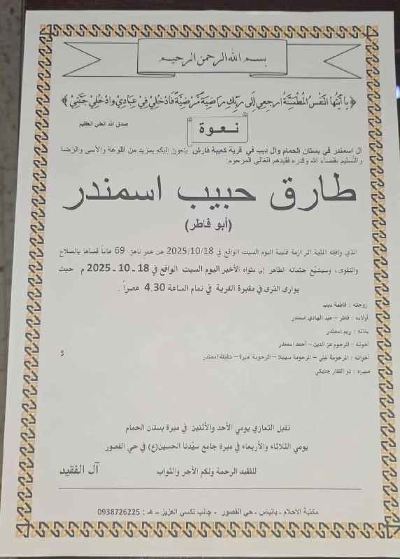 استشهاد السيد طارق حبيب اسمندر في سجون عصابات الجولاني الإرهابية يوم أمس 18 تشرين الأول/أكتوبر، وذلك بعد اعتقاله في شهر آيار/مايو، ولم يخضع السيد طارق اسمندر لأي محاكمة قضائية منذ اعتقاله.
