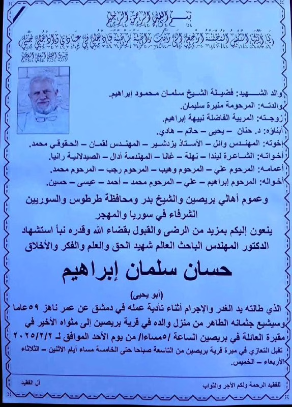 قامت عصابات الجولاني الإرهابية باغتيال الباحث العلمي الدكتور حسان سلمان إبراهيم، البالغ من العمر 59 عامًا، بعد استدراجه للعودة إلى عمله في التدريس في المعهد العالي للبحوث العلمية، إحدى أبرز المؤسسات التعليمية في سوريا.