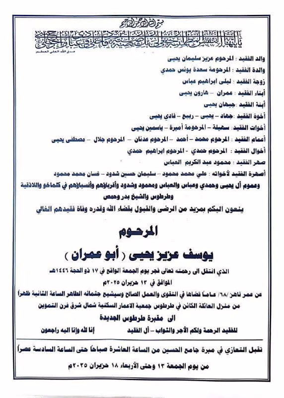 استشهد المواطن يوسف عزيز يحيى (68 عاماً) يوم أمس 13 حزيران/يونيو، متأثراً بجراحه التي أصيب بها إثر إطلاق نار من قبل مجموعة إرهابية في مدينة طرطوس قرب فرن التموين قبل ثلاثة أيام. كانت المجموعة تستقل سيارة كيا بيضاء، ويشتبه بانتمائها لجهة أمنية تابعة لسلطة النظام الجهادي. وبالرغم من تقديم كافة أوصاف السيارة للأمن العام الجهادي، إلا أنهم لم يبادروا إلى ملاحقتها، مما يثير الشكوك حول تواطئهم مع تلك المجموعة.