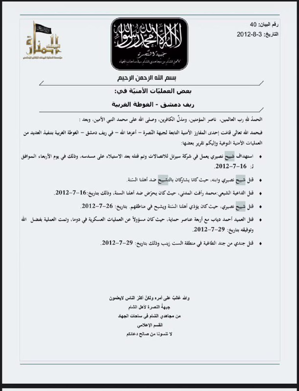 سرية اغتيالات النصرة تواصل إرهابها بأسماء جديدة