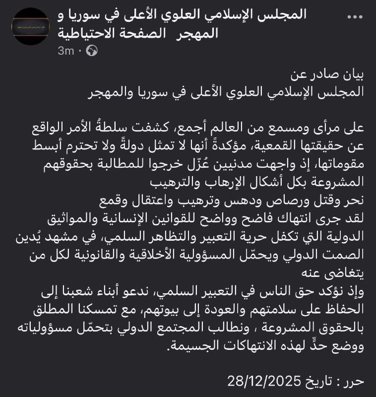 وإذ نؤكد حق الناس في التعبير السلمي، ندعو أبناء شعبنا إلى الحفاظ على سلامتهم والعودة إلى بيوتهم، مع تمسكنا المطلق بالحقوق المشروعة ، ونطالب المجتمع الدولي بتحمّل مسؤولياته ووضع حدٍّ لهذه الانتهاكات الجسيمة.