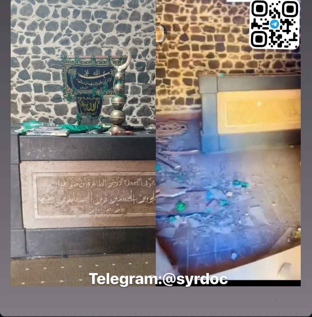 أحد الأشخاص يوثق عمليات التخريب التي لحقت بمقام علي زين العابدين على يد عناصر من عصابات الجولاني الإرهابية وعصابات الجولاني الإرهابية.