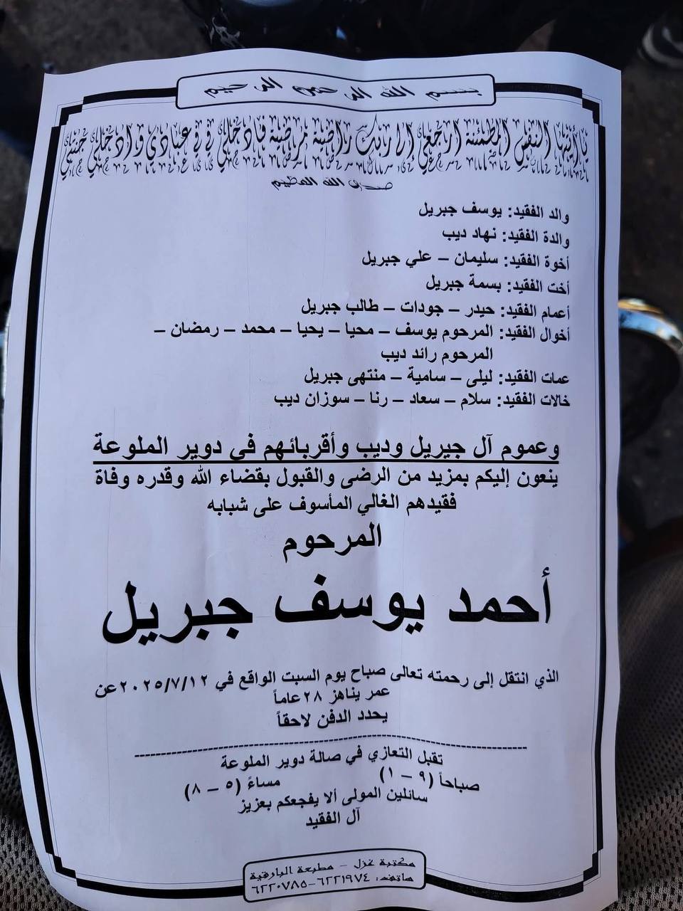 مشتى الحلو: استشهاد الشاب أحمد يوسف جبريل وإصابة شقيقه سليمان بجروح خطيرة جراء إطلاق نار مباشر عليه من قبل مجموعة إرهابية تنتمي لمليشيات عصابات الجولاني الإرهابية الجهادية، وذلك بعد منتصف ليل الجمعة 11 تموز/يوليو أمام كافيتريا في ناحية مشتى الحلو بريف طرطوس.